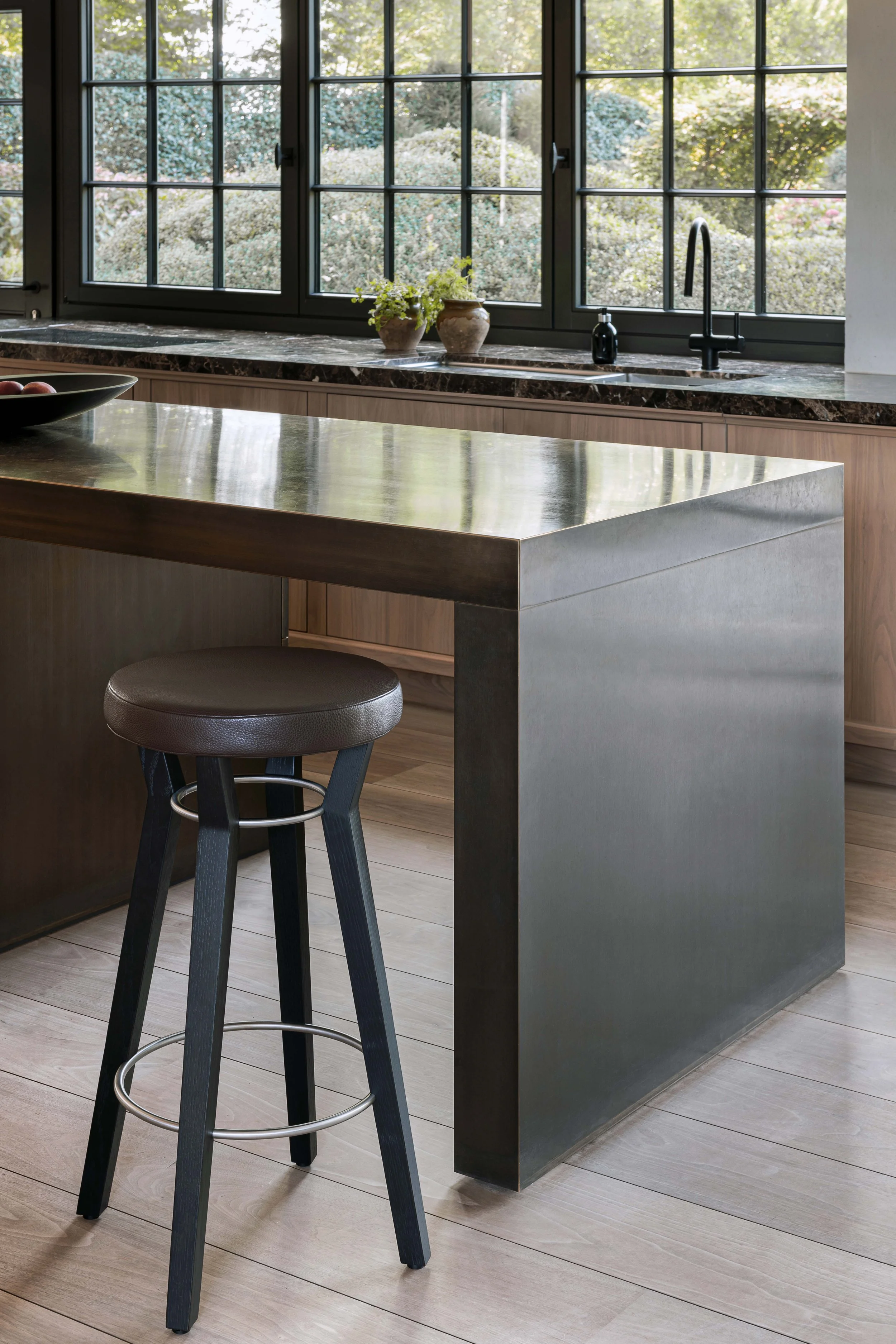 Crafted by hand in the best materials, such as solid oak or American walnut, with the seating cushion upholstered in fine leather or fabric, this barstool is custom-made following the wishes of the customer.